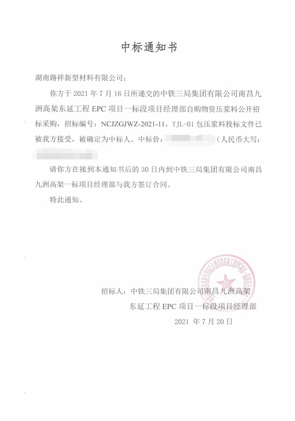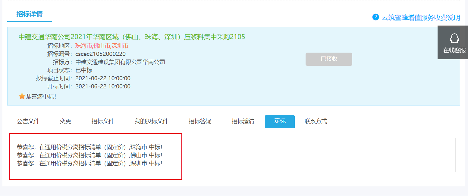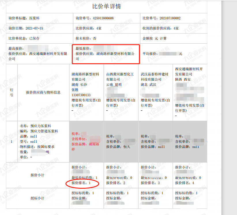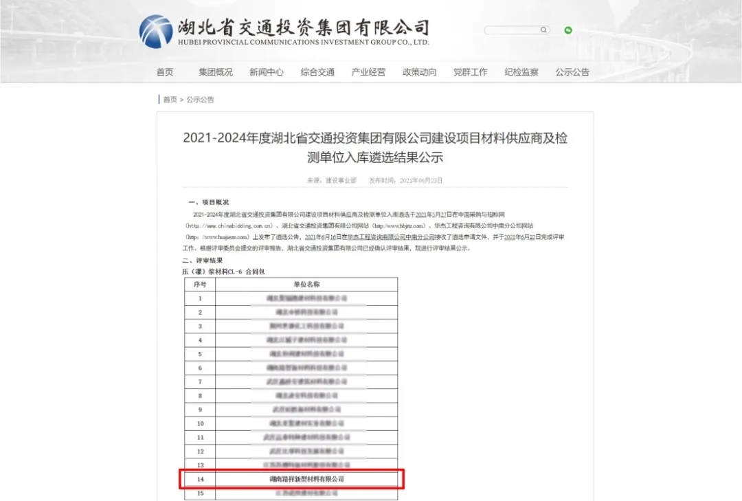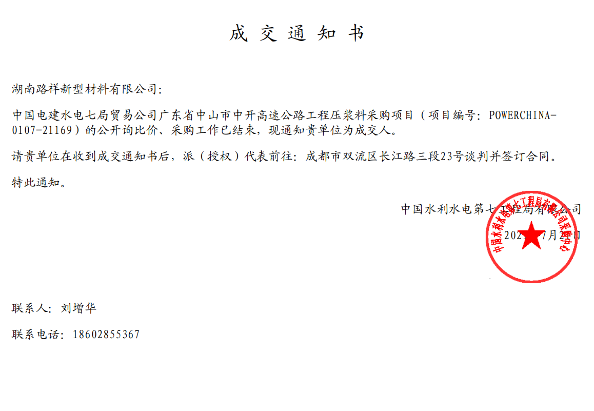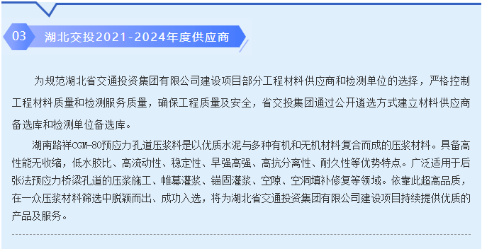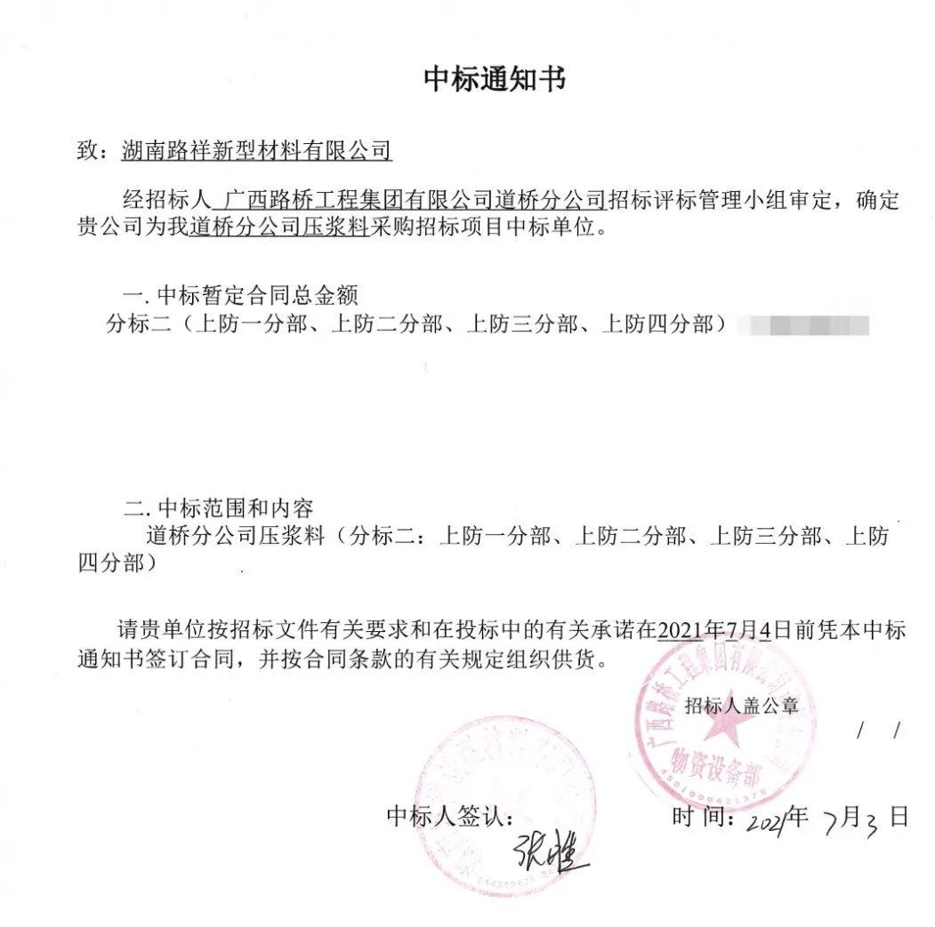 | 湖南路祥最新中標(biāo)通訊: 7月捷報頻傳,我公司在競標(biāo)中,憑借過硬的產(chǎn)品質(zhì)量,扎實高效的工作作風(fēng),卓越的運作團隊和良好的企業(yè)信譽, 1、公司遞交的廣西路橋工程集團有限公司道橋分公司上防一至四分部壓漿料采購投標(biāo)文件已被招標(biāo)人接受,被確定為中標(biāo)人。 2、中建交通華南公司2021年華南區(qū)域(佛山、珠海、深圳)壓漿料集中采購投標(biāo)文件被確定為中標(biāo)人。 3、中國電建水電七局貿(mào)易公司廣東省中山市中開高速公路工程壓漿料采購項目投標(biāo)文件被確定為中標(biāo)人。 4、中鐵三局集團有限公司南昌九州高架一標(biāo)段項目壓漿料采購?fù)稑?biāo)文件被確定為中標(biāo)人。 5、廣州市公路工程公司壓漿料采購投標(biāo)文件被確定為中標(biāo)人。 6、入選2021-2024年度湖北省交通投資集團有限公司建設(shè)項目壓漿料材料供應(yīng)商。 6、入選2021-2024年度湖北省交通投資集團有限公司建設(shè)項目壓漿料材料供應(yīng)商。 |
