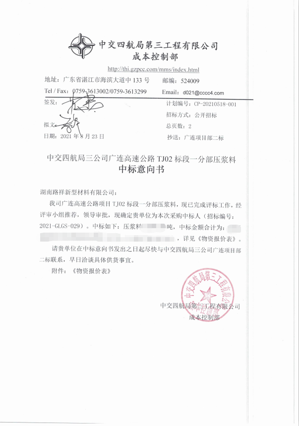 | 湖南路祥最新中標(biāo)通訊: 8月,我公司在競標(biāo)中,憑借過硬的產(chǎn)品質(zhì)量,扎實(shí)高效的工作作風(fēng),卓越的運(yùn)作團(tuán)隊(duì)和良好的企業(yè)信譽(yù),以絕對優(yōu)勢順利中標(biāo): 1、公司遞交的廣州公路工程集團(tuán)有限公司南沙至中山高速公路TJ07合同段壓漿劑、壓漿料采購?fù)稑?biāo)文件已被招標(biāo)人接受,被確 定為中標(biāo)人。該項(xiàng)目是我司單業(yè)績達(dá)到千萬以上合同額合同,進(jìn)一步鞏固了路祥在華南市場的優(yōu)勢地位。 2、中交四航局三公司廣連高速公路TJ02標(biāo)段一分部壓漿料采購?fù)稑?biāo)文件被確定為中標(biāo)人。 3、中鐵廣州局南玉鐵路壓漿料、灌漿料采購?fù)稑?biāo)文件被確定為中標(biāo)人。 ![]() ![]() ![]() ![]() 湖南路祥將始終堅(jiān)持“以質(zhì)量求發(fā)展、以誠信求生存”的經(jīng)營理念,為廣大客戶提供一流的產(chǎn)品,完善的售后服務(wù),愿與各界朋友攜手并進(jìn)、精誠合作、同謀共贏。 更多中標(biāo)展示(請點(diǎn)擊鏈接查看):https://mp.weixin.qq.com/s?__biz=MzA5NTQyNzk4Mw==&mid=2247483743&idx=1&sn=0073de88318d4839529879ad72a84bc3&chksm=90becdbfa7c944a9c7e54da7f09b4ab6db3b88c656728c00d08858caa7103623aec8cdef1cc1&token=1106113315&lang=zh_CN#rd |