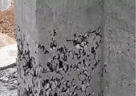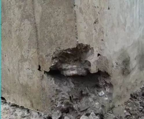 五、爛根 (1)模板根部縫隙堵塞不嚴(yán),漏漿; (2)澆注前未下混凝土配合比和成份相同的無(wú)石子砂漿; (3)混凝土和易性差,水灰比過(guò)大,石子沉底; (4)澆筑高度過(guò)高,混凝土集中一處下料,混凝土離析或石子趕堆; (5)振搗不實(shí); (6)模內(nèi)清理不凈、濕潤(rùn)不好。